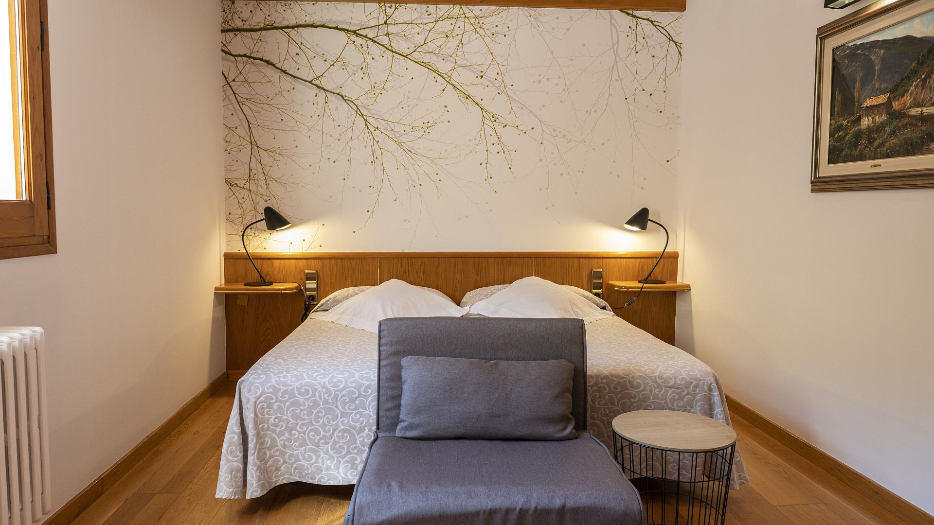 Amplia habitación doble con la opción de una cama supletoria. Decorada con detalles de madera y suelos de parqué. Todas las estancias disponen de ventana al exterior.